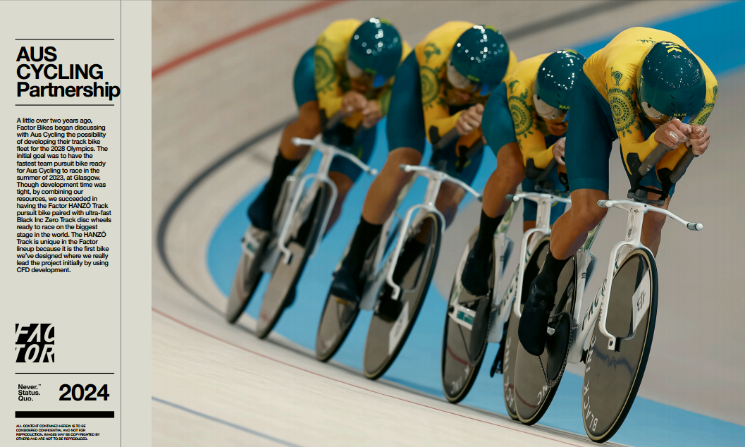 A little over two years ago, Factor Bikes began discussing with Aus Cycling the possibility of developing their track bike fleet for 2024 and 2028. The initial goal was to have the fastest team pursuit bike ready for Aus Cycling to race in the summer of 2024.