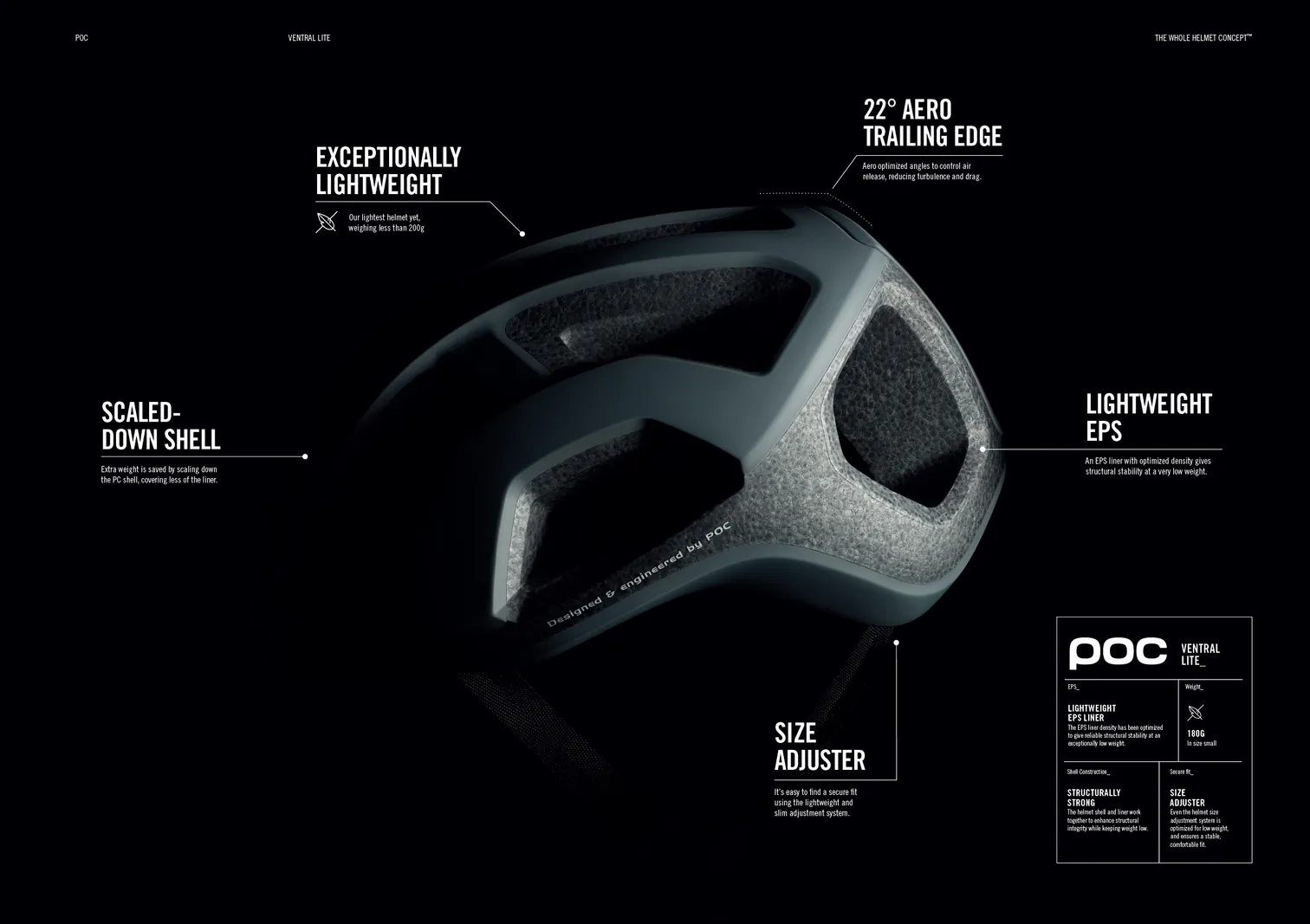 Every aspect of the helmet, from the adjustment system and straps to the liner and shell, are optimized for protection at the lowest weight possible. The entire helmet structure has been altered so that a different density of EPS liner can be used. The outer PC shell is scaled back to the absolute essentials, keeping the weight down.