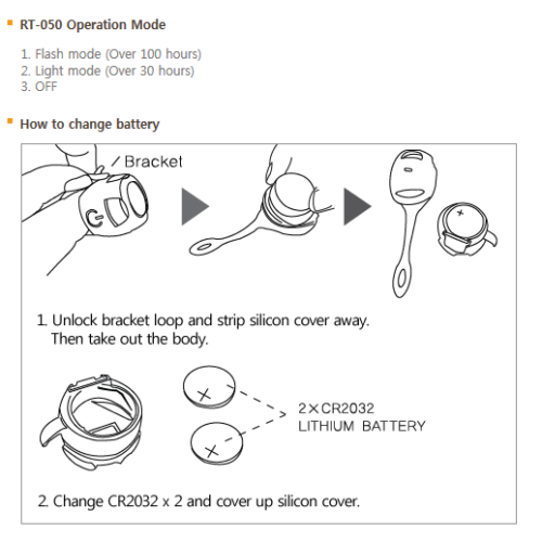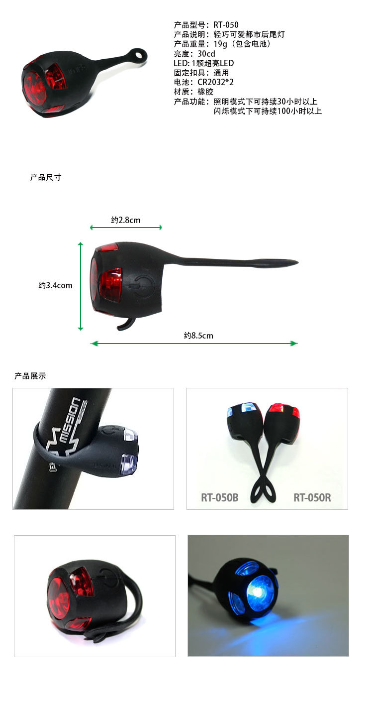 RT-050 is small, lightweight and bright. Ituses tool-free quick release mounting, therefore you can easily mount them oneither handlebar, seatpost or helmet. WHITE and RED LED are also available inour store.