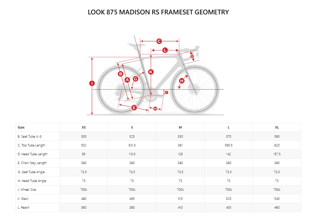 The geometry of the 875 is completely newand perfectly complements the range of LOOK track products, namely the T20, R96and AL 464. The 875 MADISON RS possesses a competition-inspired geometry thatis available in 5 sizes, allowing each cyclist a perfectly adapted cyclingposition.