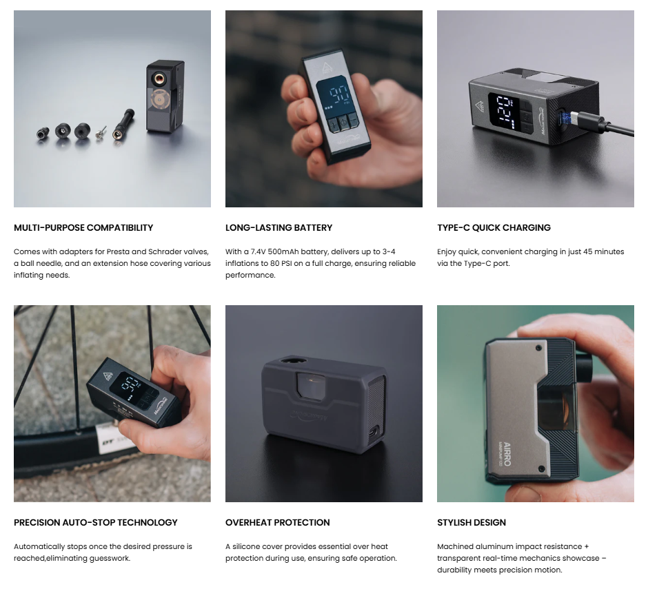 • Portable and lightweight, perfect for travel, roadside fixes, or regular rides.