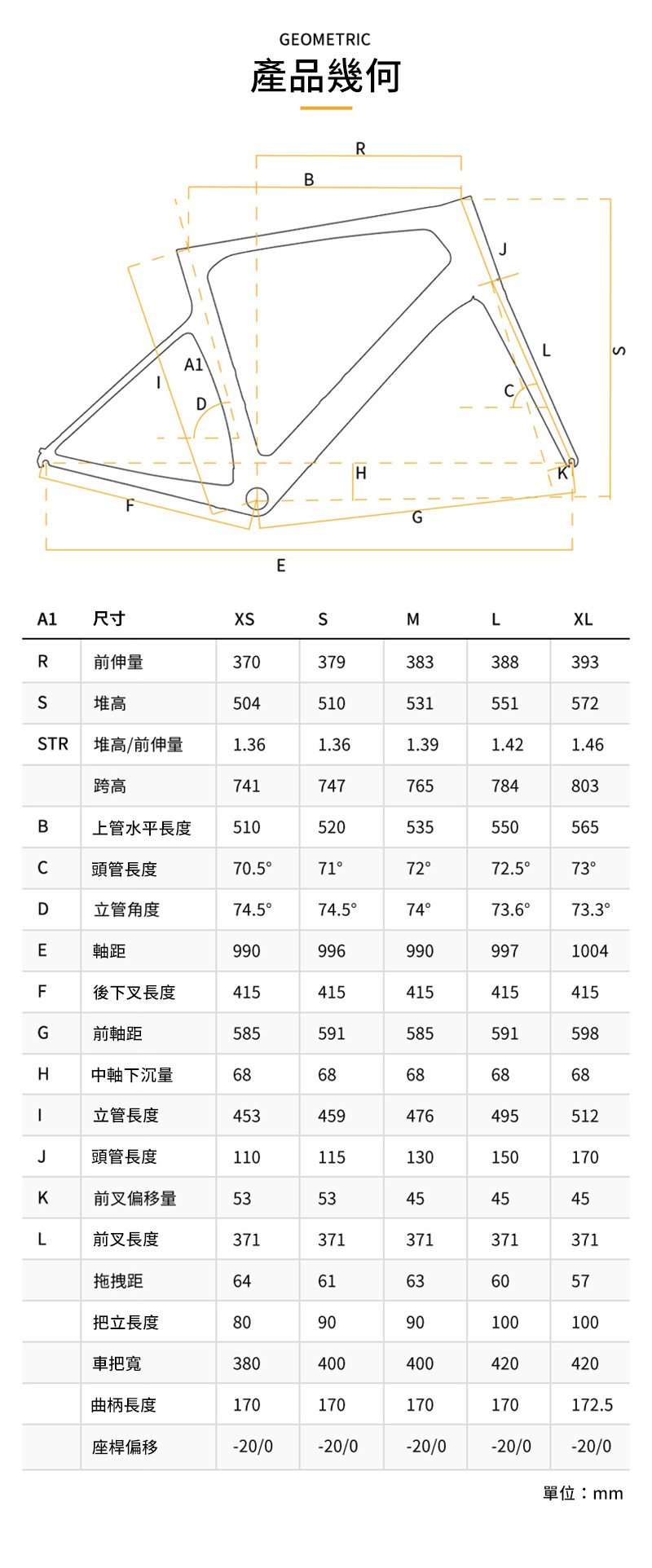 極速衝刺,劃破空氣!SPARK 是PARDUS(瑞豹)運動自行車氣體力學風格系列產品,總體偏小的STACK值是SPARK保持氣體力學性能的關鍵。更下趴的上身使中心前移,為了保證操作穩定性,XS與S碼需要有較小的頭管角度,同時使用加大OFFSET前叉,使XS和S碼拖拽值(TRAIL)控制在合理的範圍,保證最小和最大尺寸都保持著應有的靈活性。