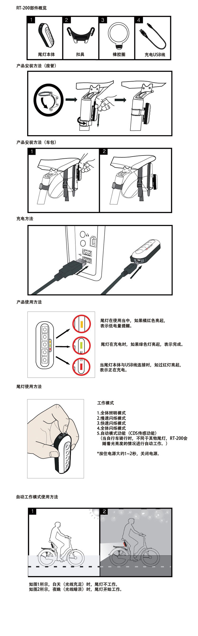 產品功能: 光學、振動雙重感應;車包和座管便利安裝;全體閃爍模式下可持續工作7小時以上